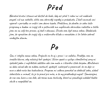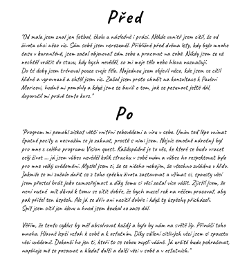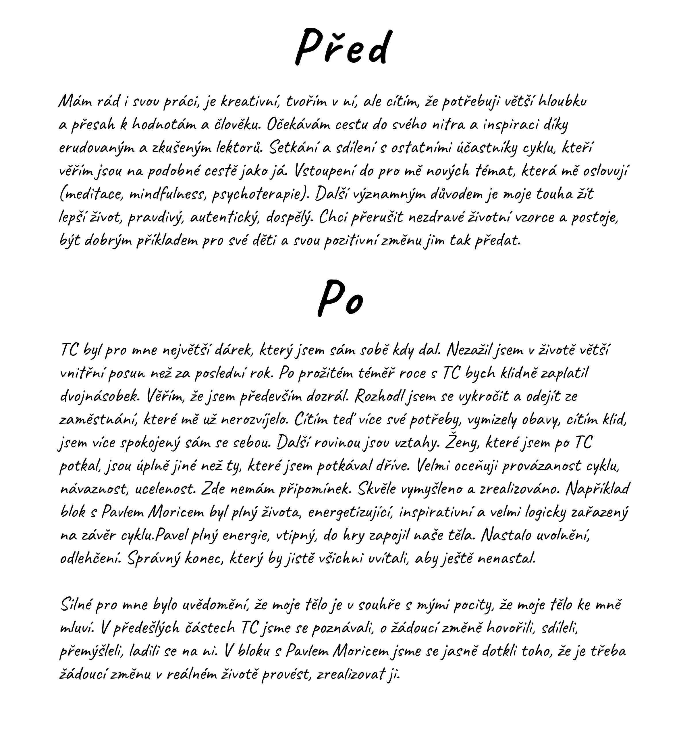 „Klasické vzdělávání učí o světě kolem nás. O světě v nás mlčí. Klasická medicína léčí symptomy. O příčinách mlčí. My se zaměřujeme na vnitřní příčiny. Protože to, co rozhoduje o naší spokojenosti, je naše vnitřní naprogramování. Udělej krok k opravdové spokojenosti - rezervuj si místo. “