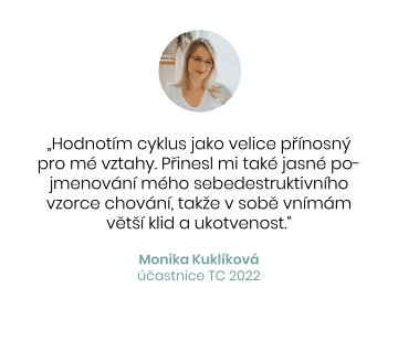 Dotknete se své vnitřní síly a to, na co jste si v cyklu přišli, integrujete do každodenního života. Protože o to jde především, aby vám bylo dobře nejen v rámci kurzu a skupiny, ale především mimo něj s vašimi nejbližšími.