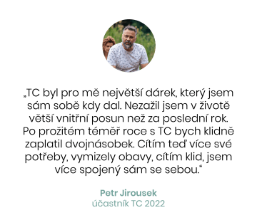 Petr je kromě mnoha svých kvalit a zkušeností také bývalým účastníkem Transformačního cyklu, který ho natolik oslovil a proměnil, že se chtěl nadále osobně zapojit. Vítáme proto našeho nového lektora v zácviku, který má již nyní mnohé osobní zkušenosti s vedením lidí který má již nyní mnohé osobní zkušenosti s vedením lidí především jako průvodce doprovázených poutí.